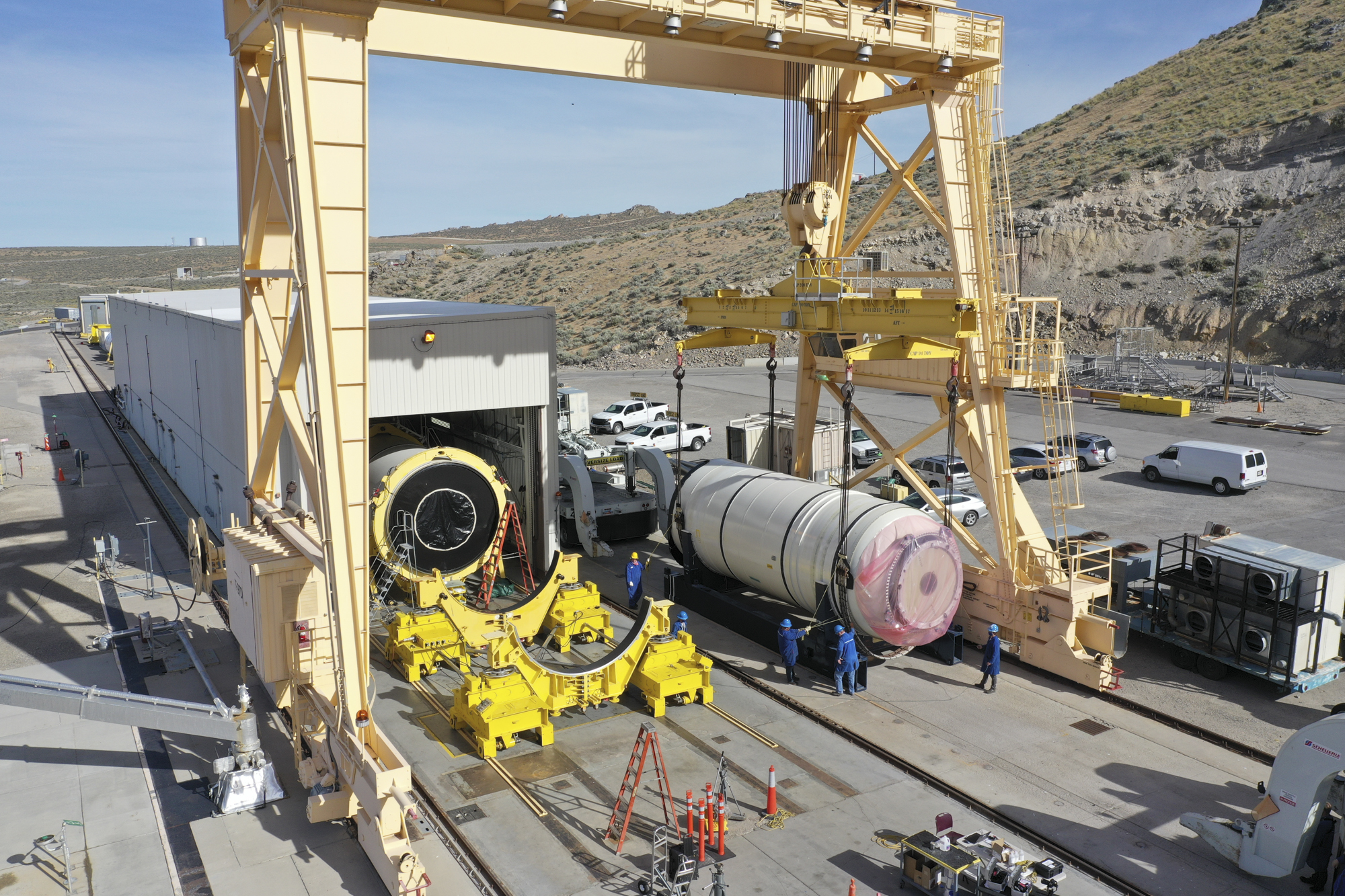 Engineers mate two segments of the five-segment booster.